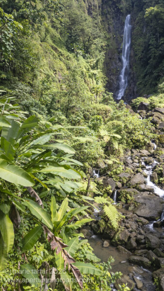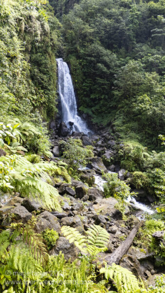 After checking out a few giant trees in the Botanical Garden (including one with a squashed school bus embedded in it, the victim of a hurricane in the past), we were driven up to Trois Piton National Park and the twin Trafalgar Falls.