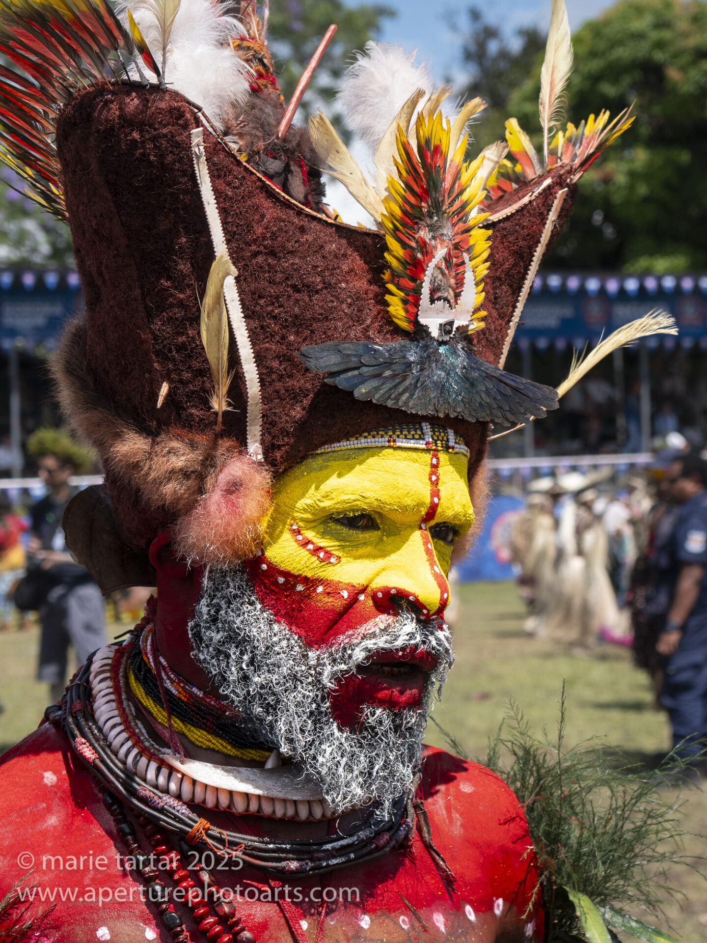 Extraordinary body decoration with colorful pigments, bird feathers, necklaces and a helmet of hair distinguish the Huli wigmen at the annual Goroka Show in Papua New Guinea.