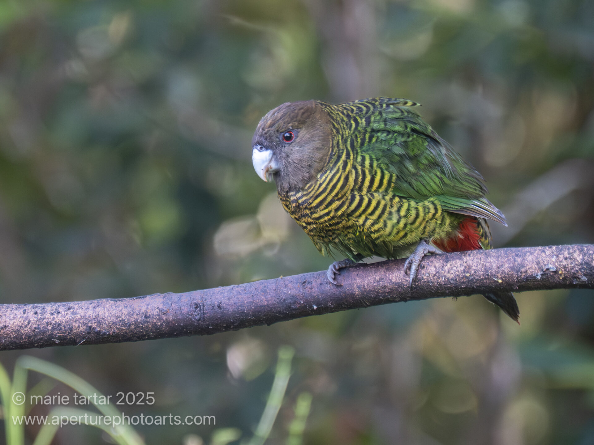 Female Brehm’s Tiger-Parrot is distinguished from the male by the absence of a yellow collar ((Psittacella brehmii)) bordering the brown head.